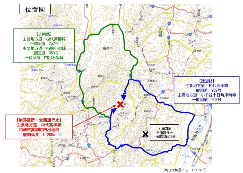主要地方道「松代高柳線」(県道12号)の門出付近の道路崩落により、荻ノ島から門出までの区間で全面通行止めとなっています。
