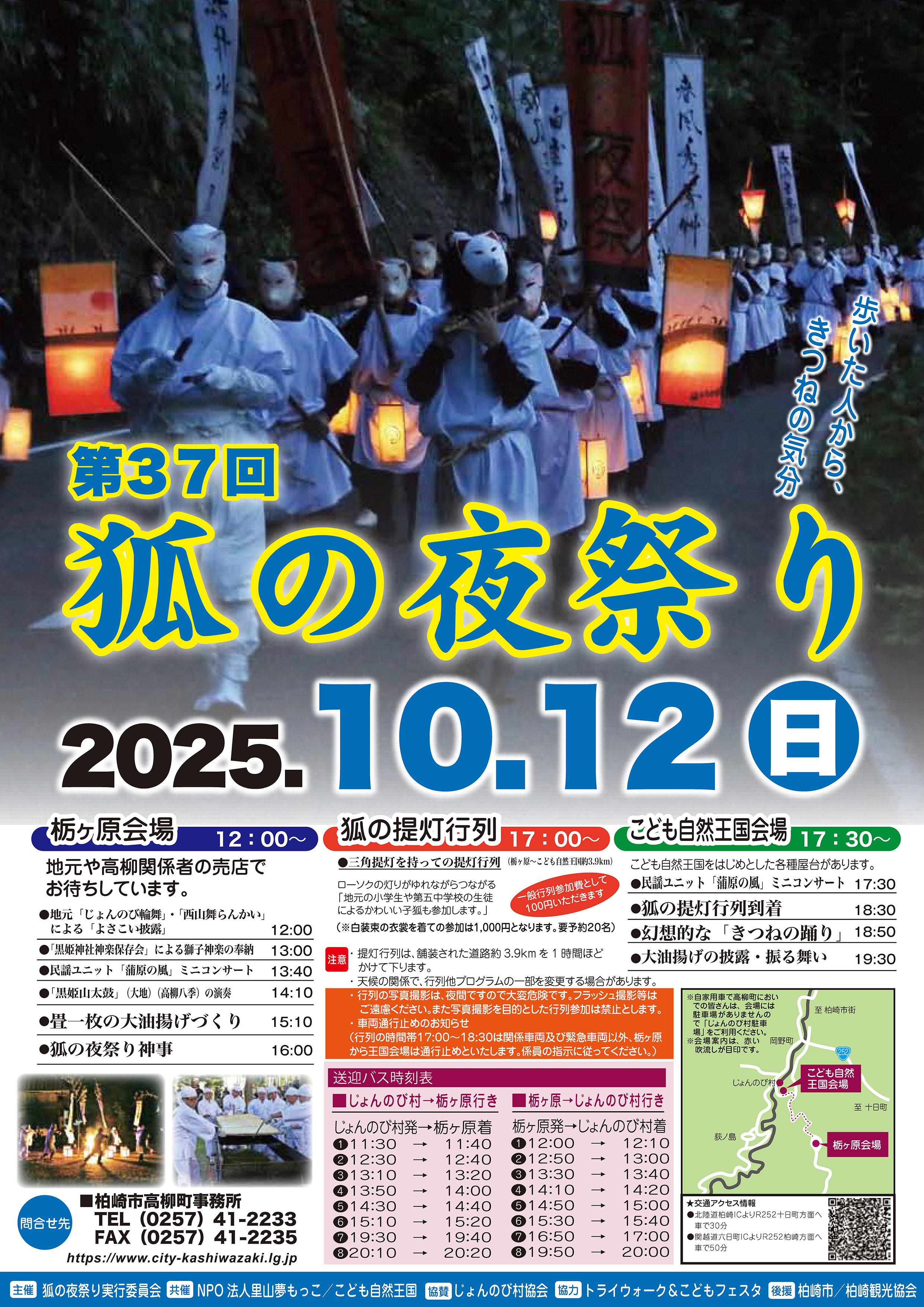 狐の夜祭りは、高柳町栃ヶ原地区に伝わる”藤五郎狐”という民話をモチーフに、平成元年に始まりました。 栃ヶ原の狐が大好物の畳一畳の大油揚げを揚げ、提灯をかざして山道を麓の漆島地区まで行列します。この祭りは、主催する側と参加する方が力を合わせてはじめて成り立ち、見て楽しむだけではなく歩いた人が楽しめる祭りです皆様のご参加お待ちしております。